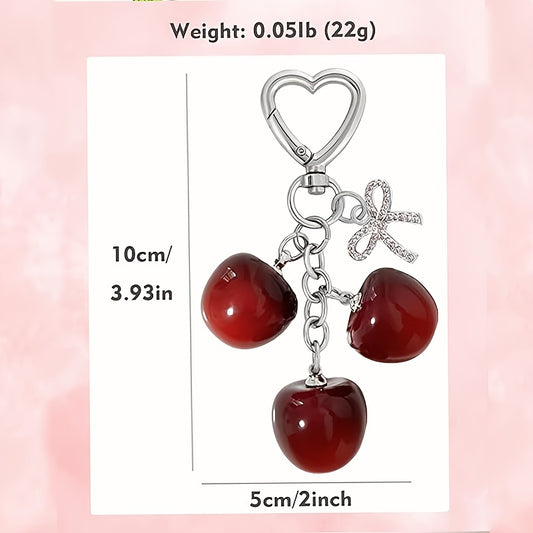 Portachiavi a forma di ciliegia con fiocco e ciondolo a forma di cuore - Resina rossa, finiture dorate - Ideale per borse da donna, portafogli, accessori per San Valentino, ciondolo per borsa a forma di ciliegia