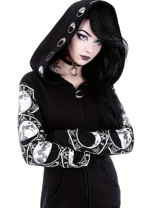 Black & White Moon Hoodie, Large Hooded Zip Up Front Pocket Sweater, Gothic Casual Tops, Women's Clothing