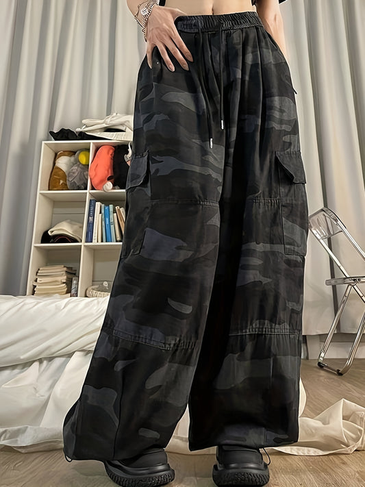 Camouflage Print Wide Leg Cargo Pants, Casual Elastic Waist Loose Pants for Spring & Summer, Women's Clothing