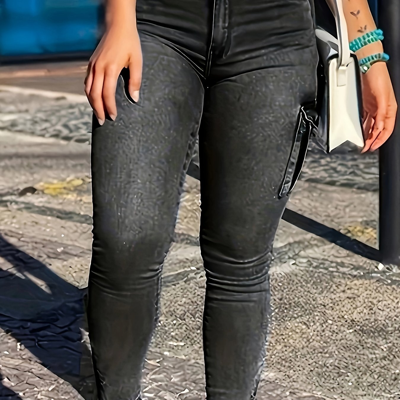 Jeans skinny con orlo con cerniera, pantaloni cargo casual in denim elasticizzato multitasche, jeans e abbigliamento in denim da donna