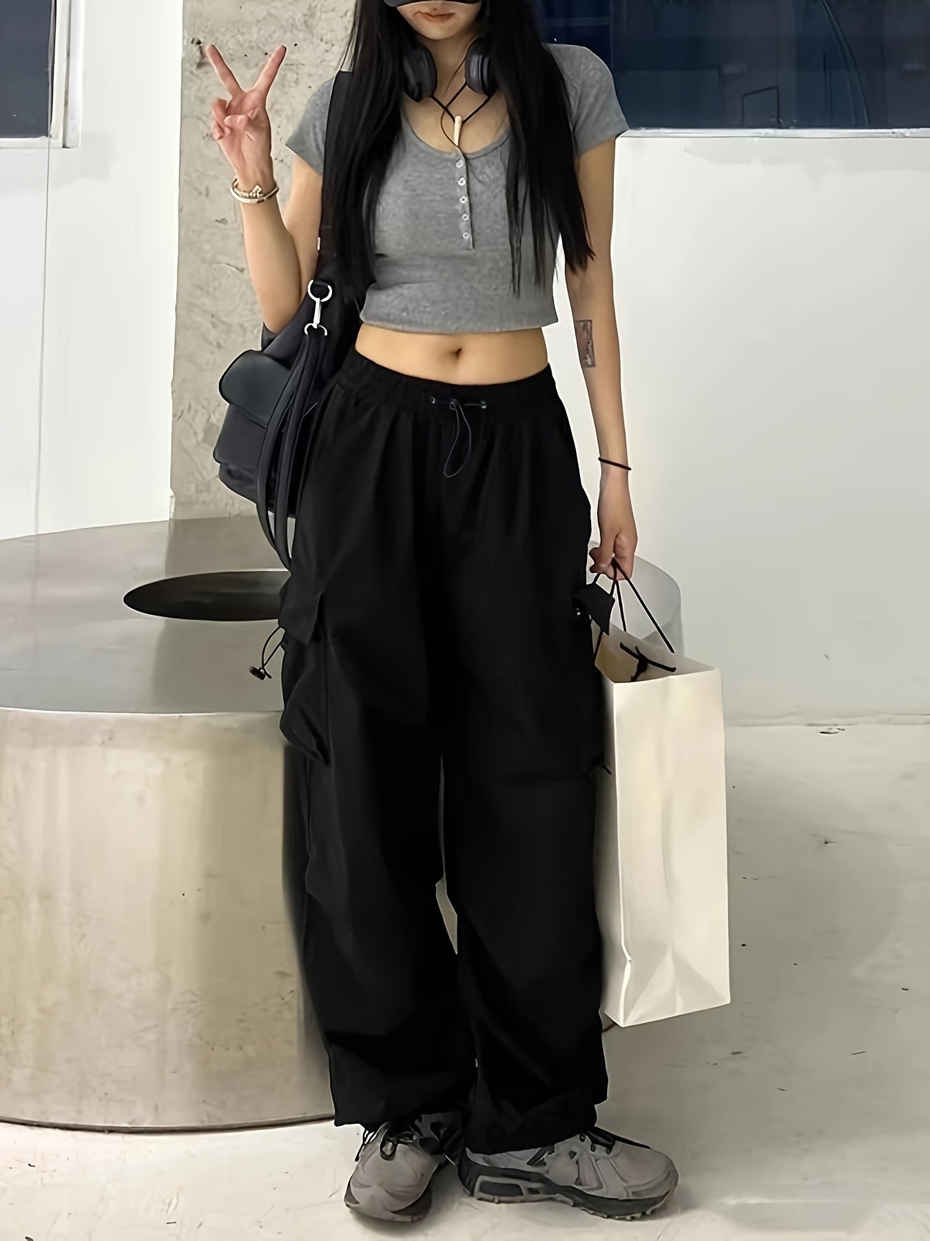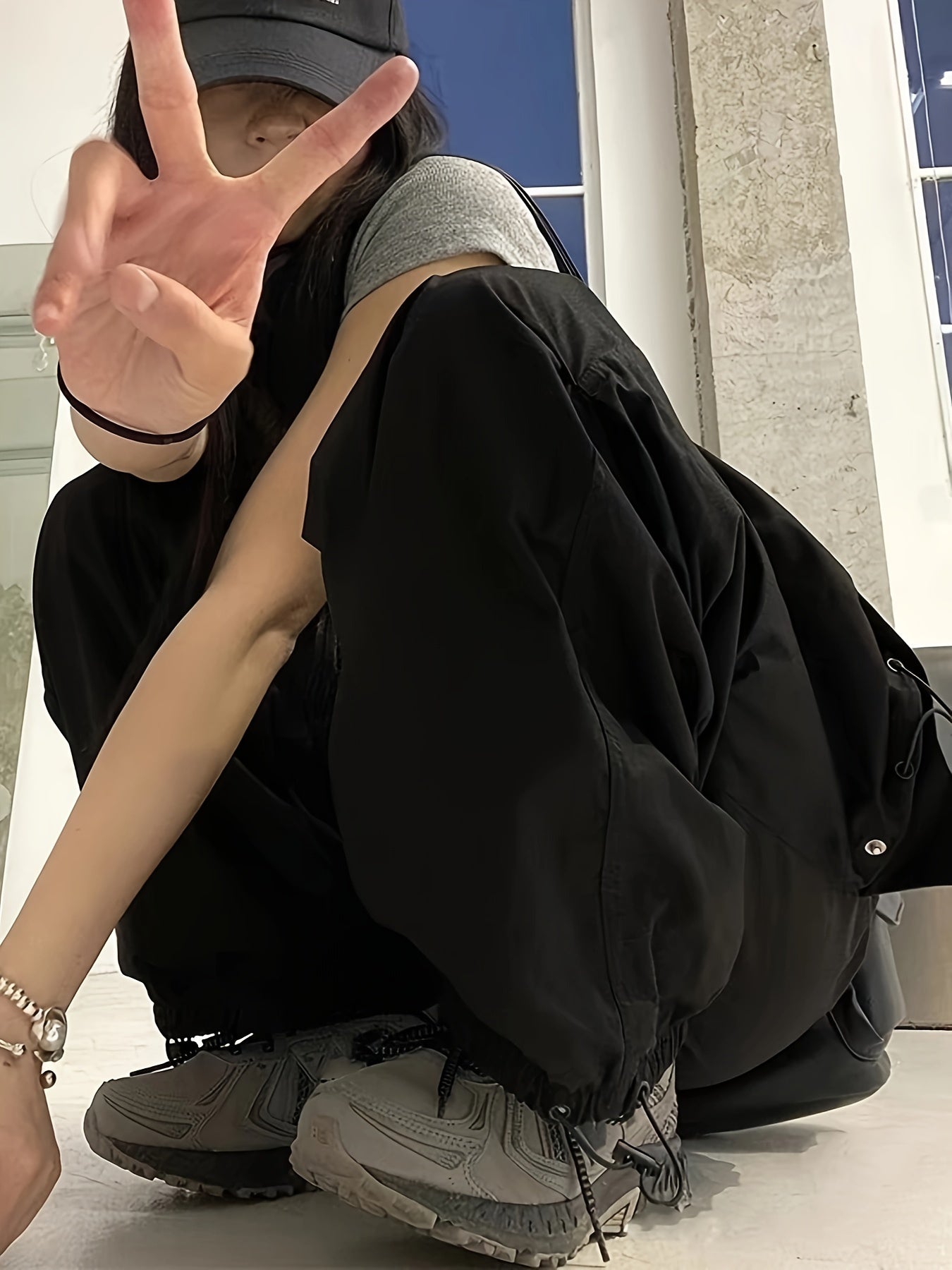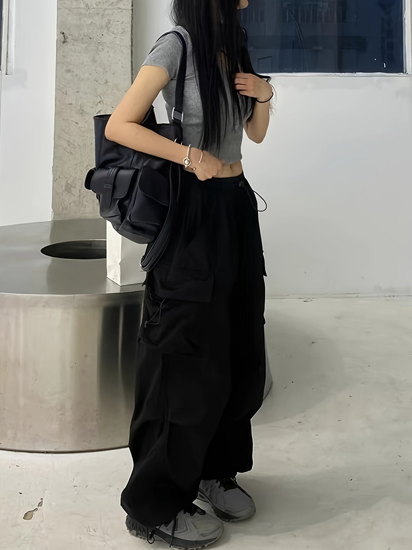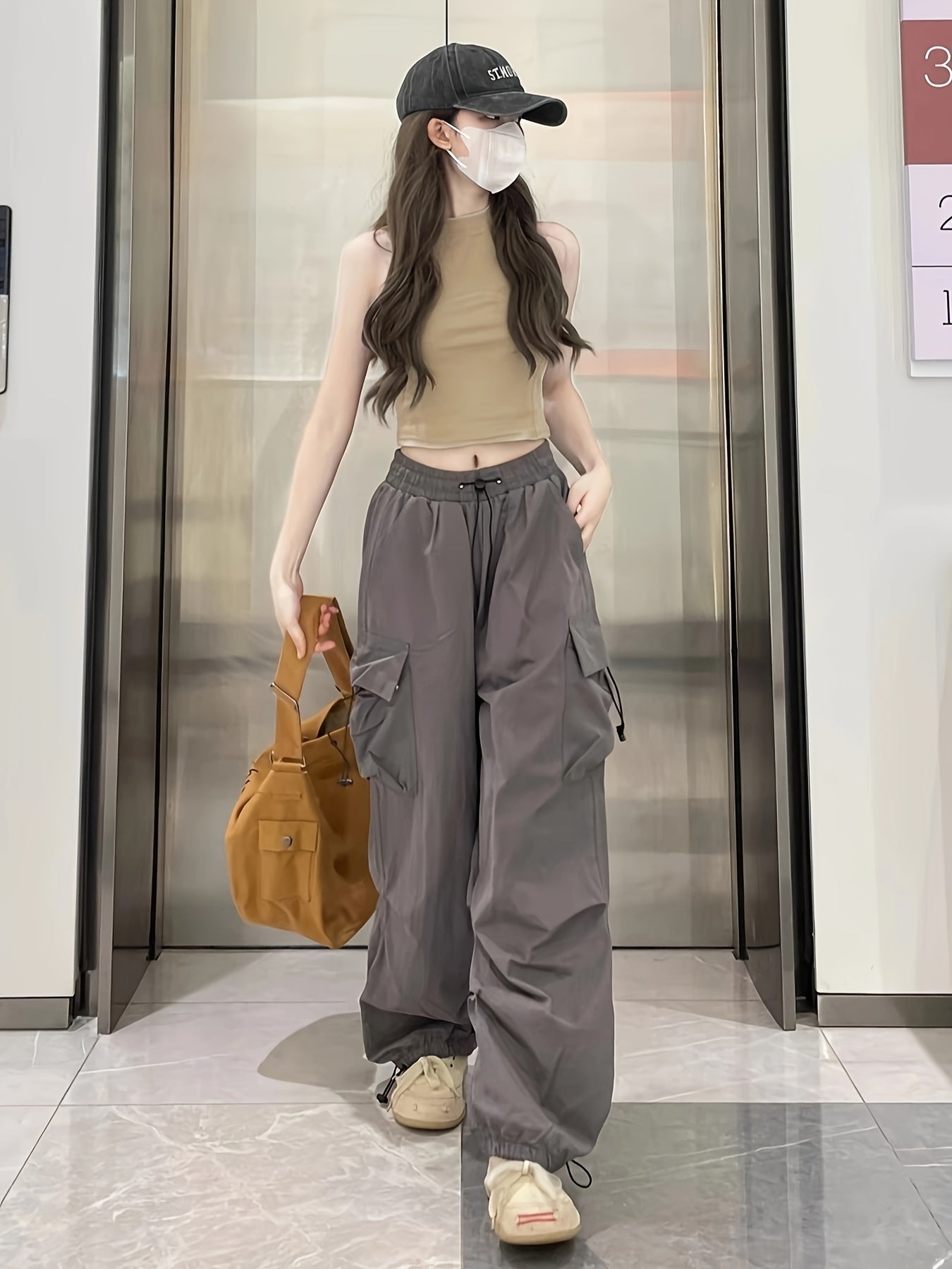 1pc Women'S Casual Cargo Pants, Solid Color Polyester, Spring/Fall Fashion, Multiple Pockets, Woven Weave, Adult Fit