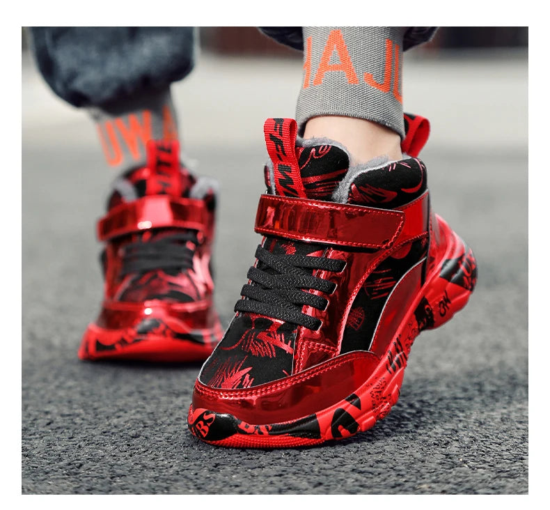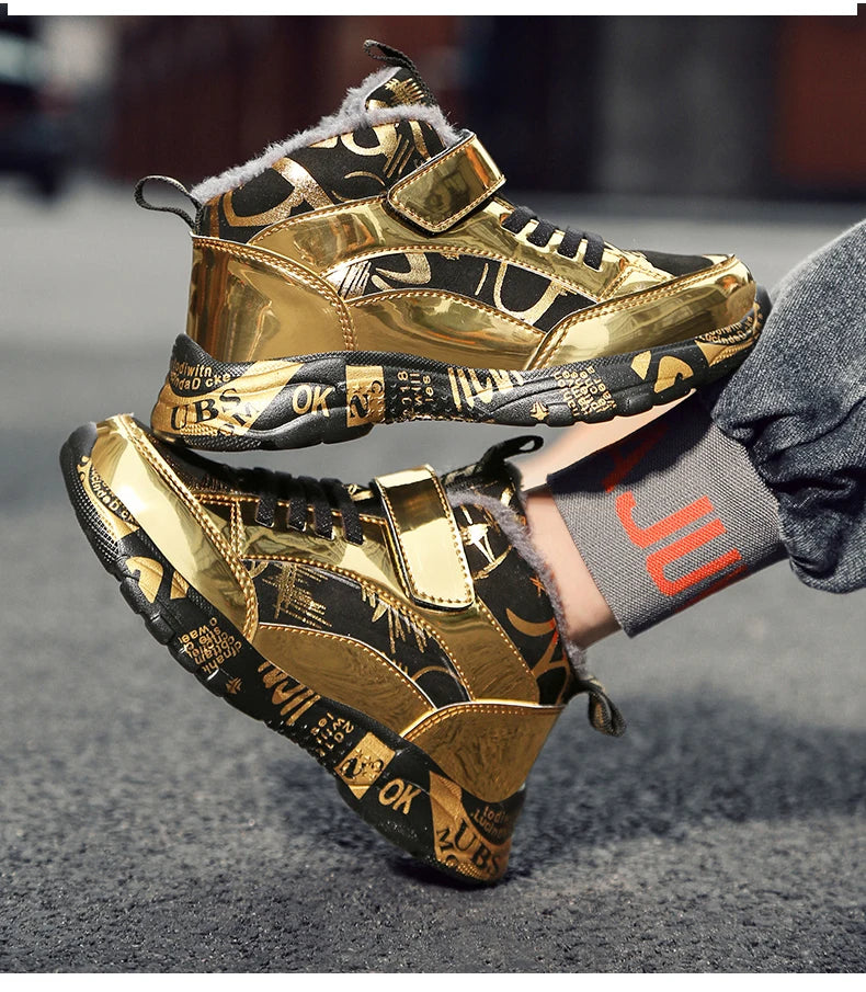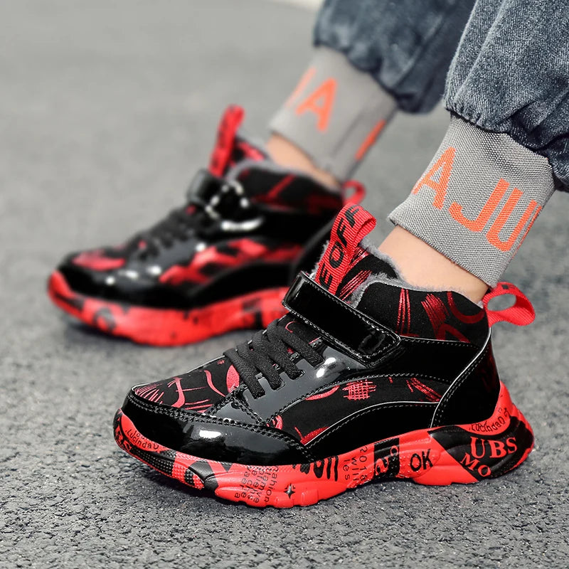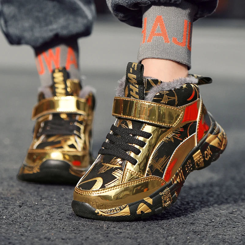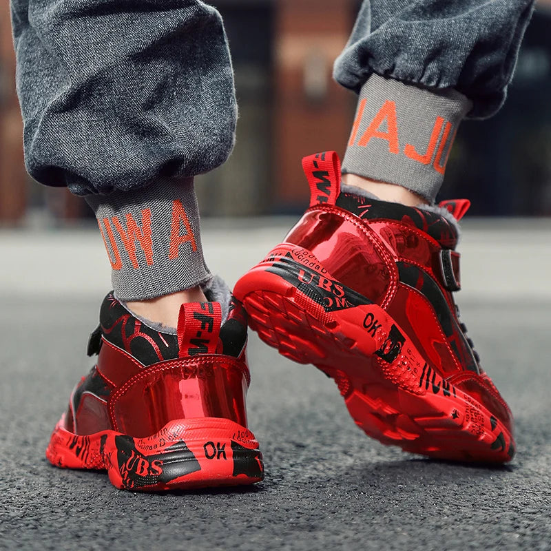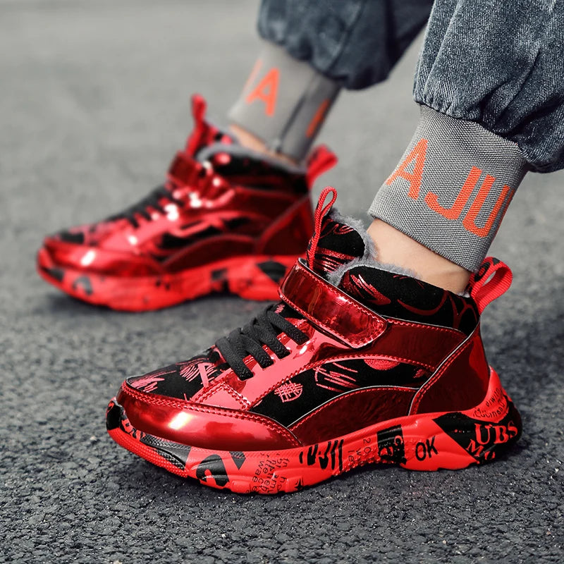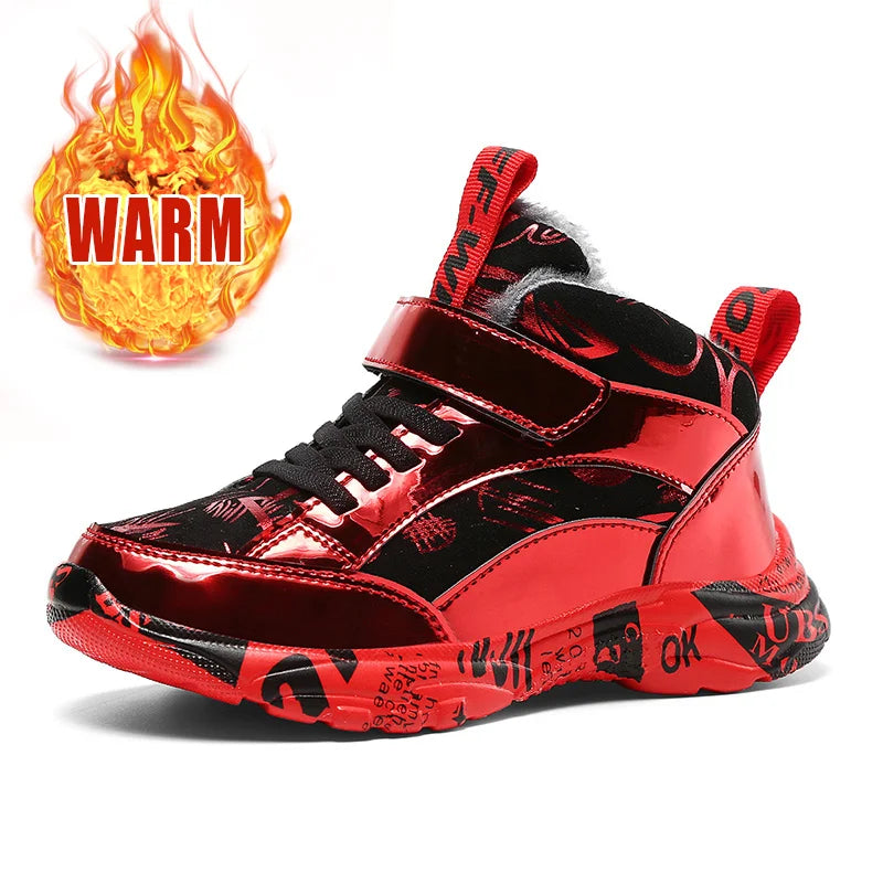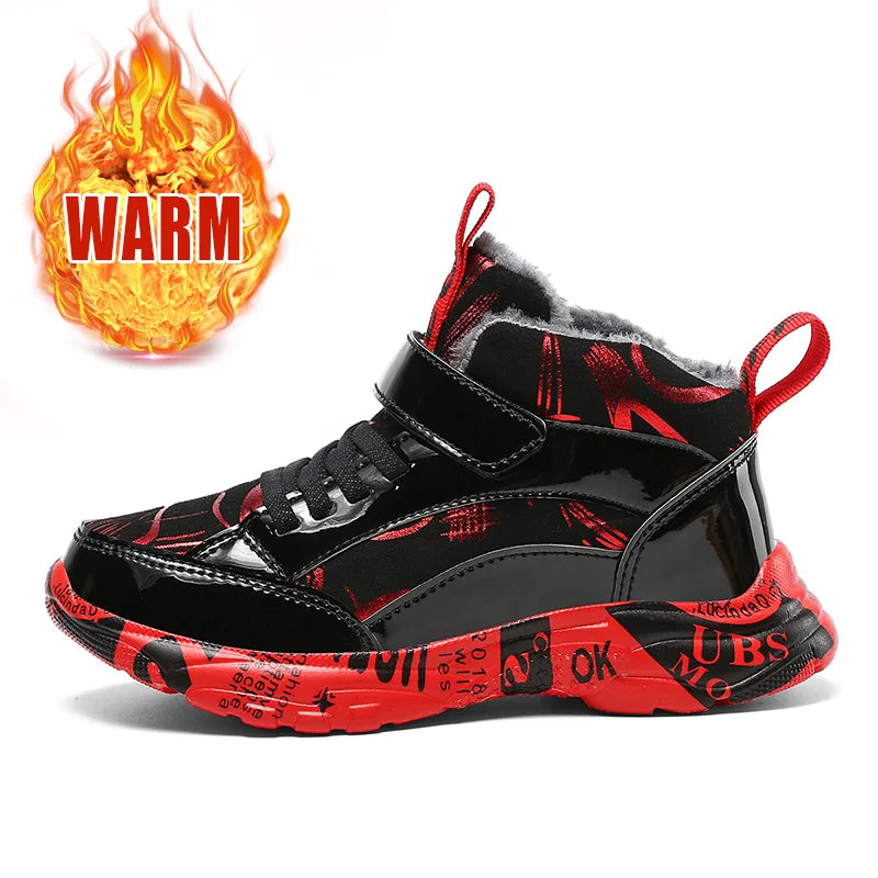 2025 Scarpe invernali per bambini Stivali da ragazza per ragazzo Stivali da neve per bambini in pelle PU resistenti all'acqua Scarpe da ginnastica calde di moda in peluche Scarpe da esterno casual