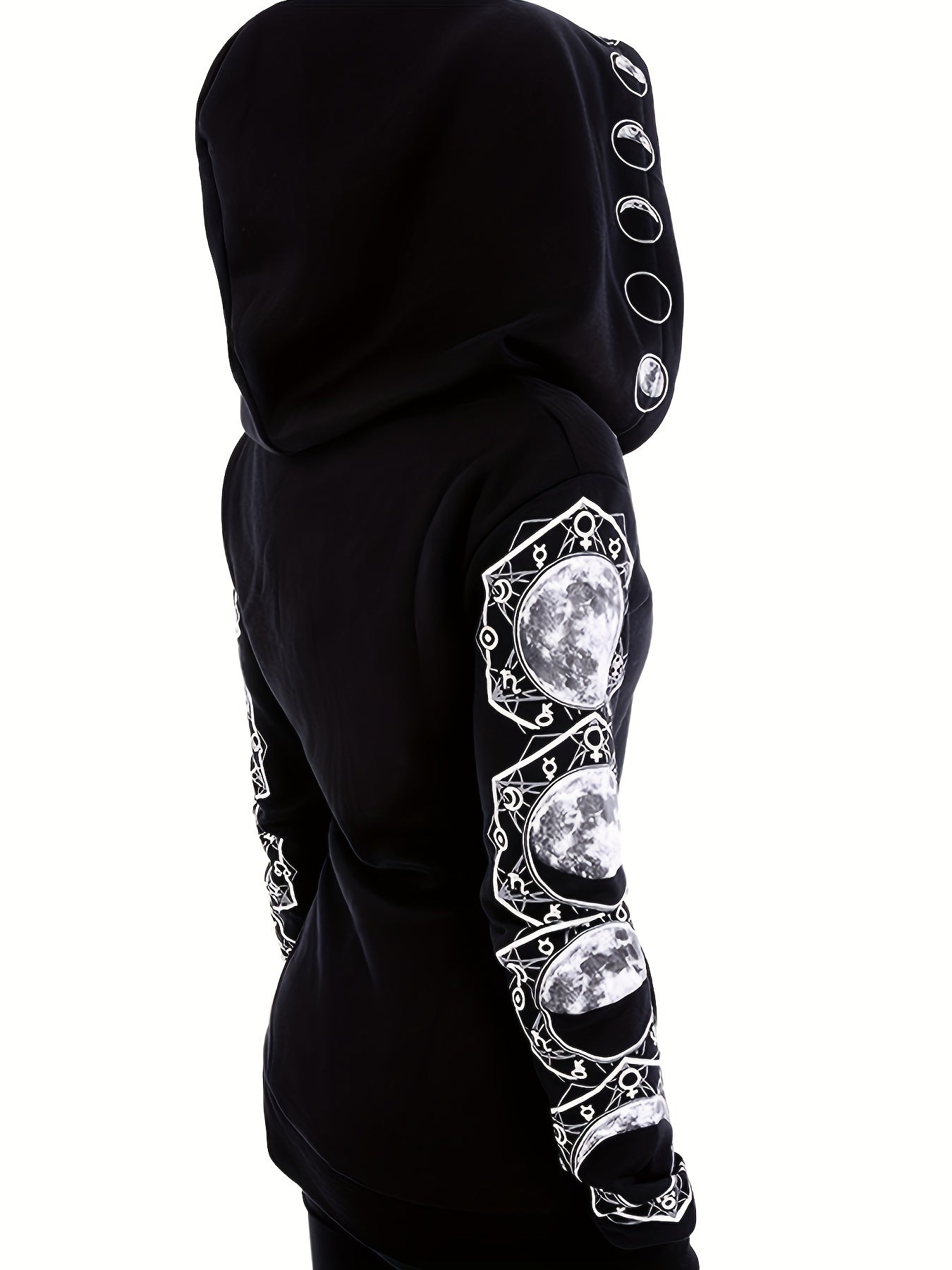 Black & White Moon Hoodie, Large Hooded Zip Up Front Pocket Sweater, Gothic Casual Tops, Women's Clothing