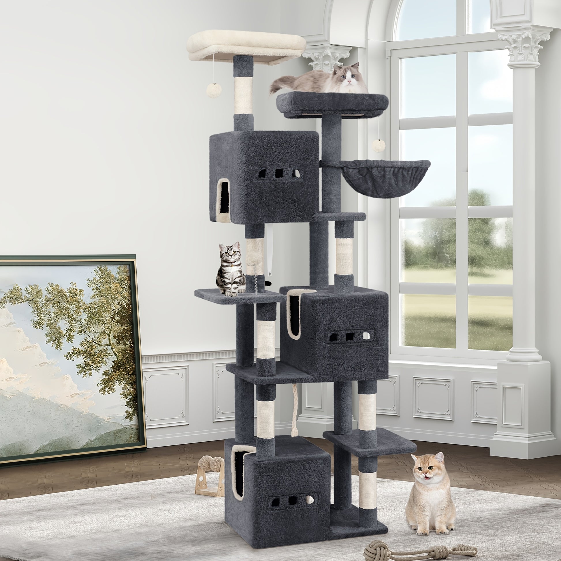 Large Scratching Post, 193cm Cat Tree, Multi-storey Cat Scratching Post for Large Cats, with 3 Caves, 6 Scratching Posts, 1 Lounger, 3 Plush Balls, Dark Grey/light Grey